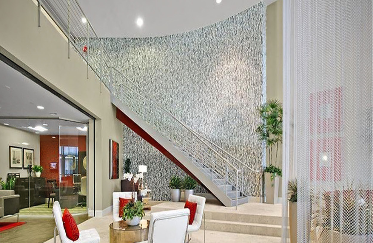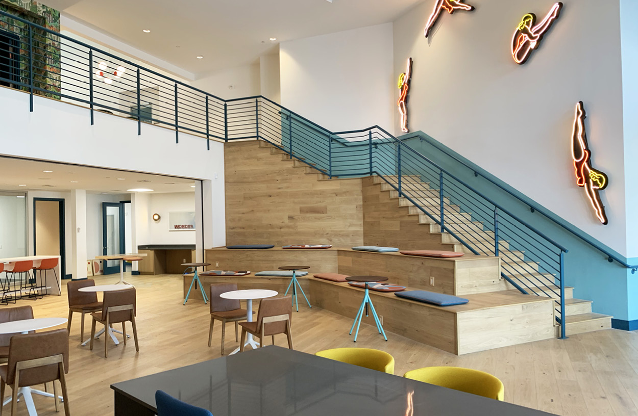 Eliminating the dated arched stairway and typical business center, we created a leasing center that would be the ultimate gathering spot for residents.