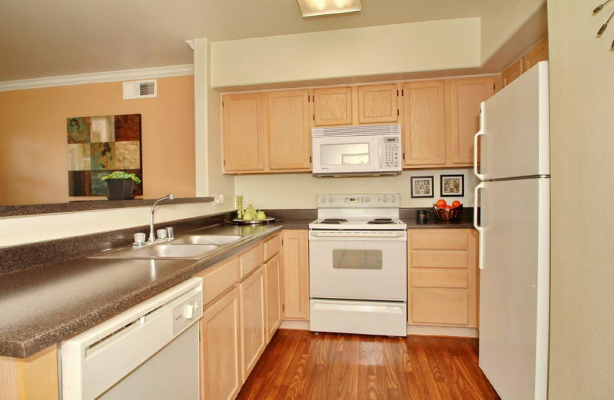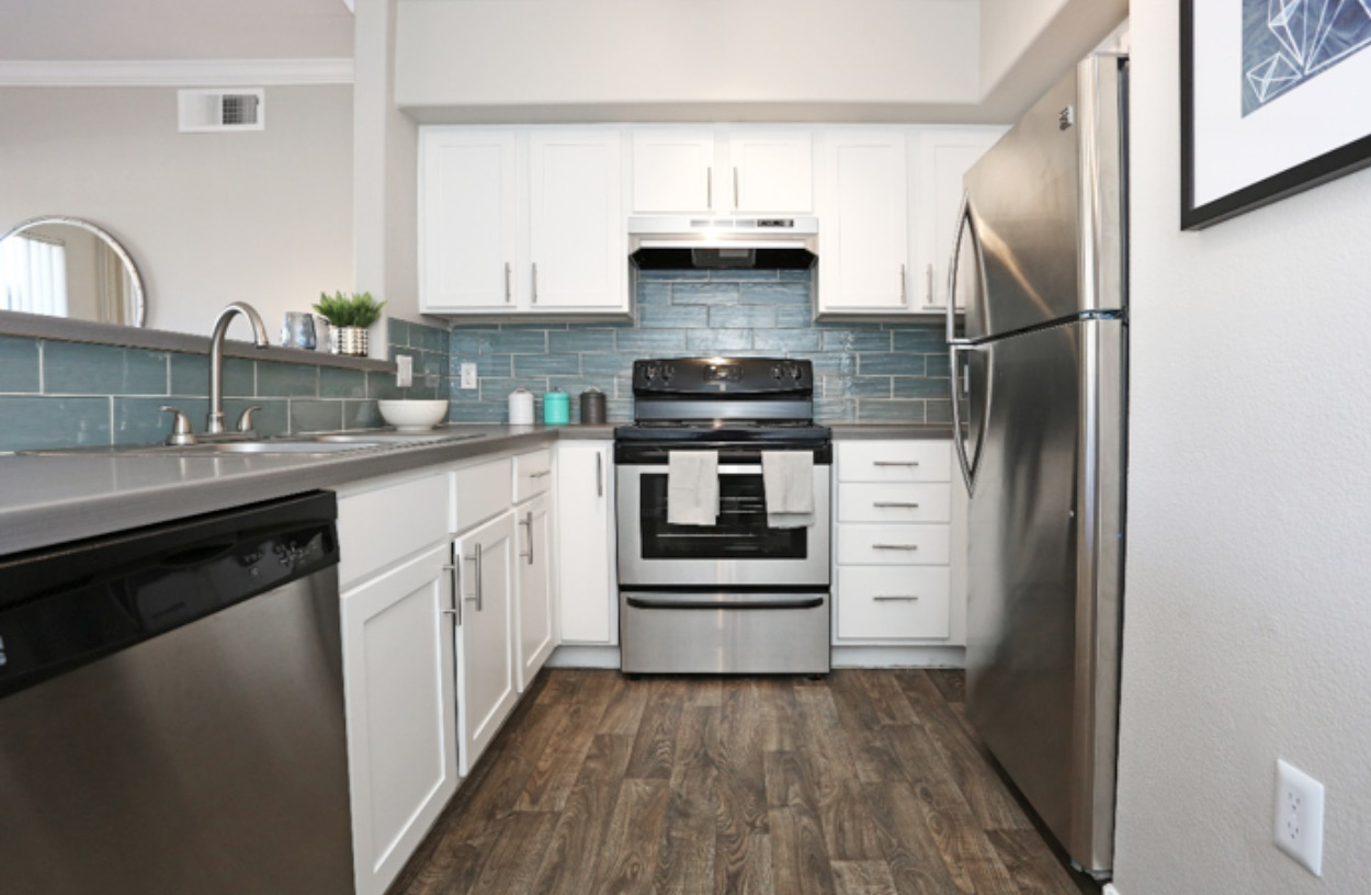 Our newly renovated kitchens feature glass backslash, new design formica counters, wood like plank flooring, newly refinished cabinets and new cabinet hardware, new stainless steel appliance and two-tone paint scheme.