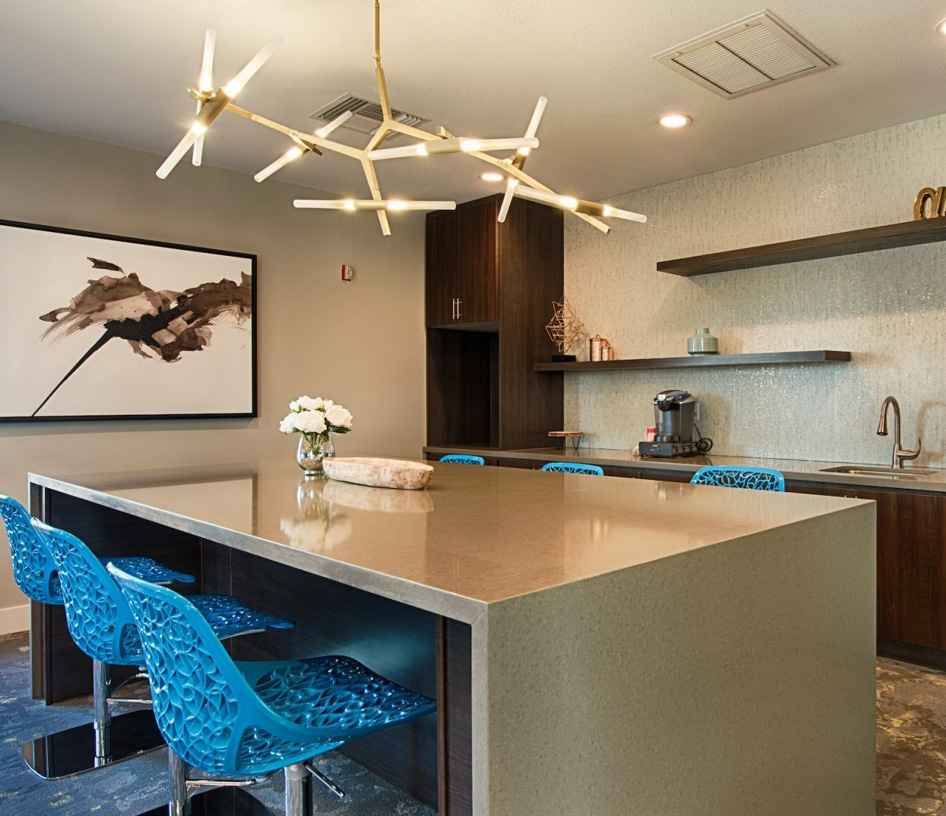 Demonstration kitchen in the clubhouse is perfect for private parties or residents to drop in for a cup of coffee and use the community Wi-Fi.
