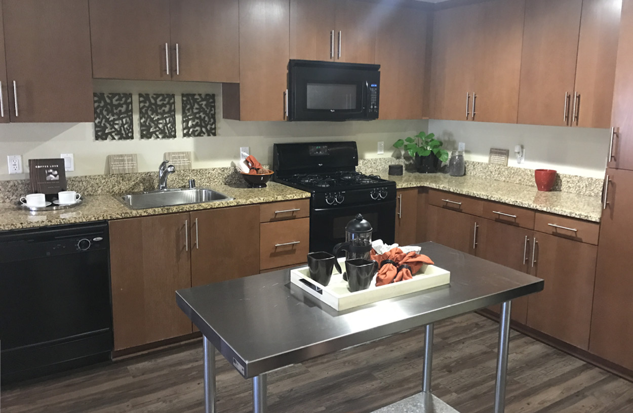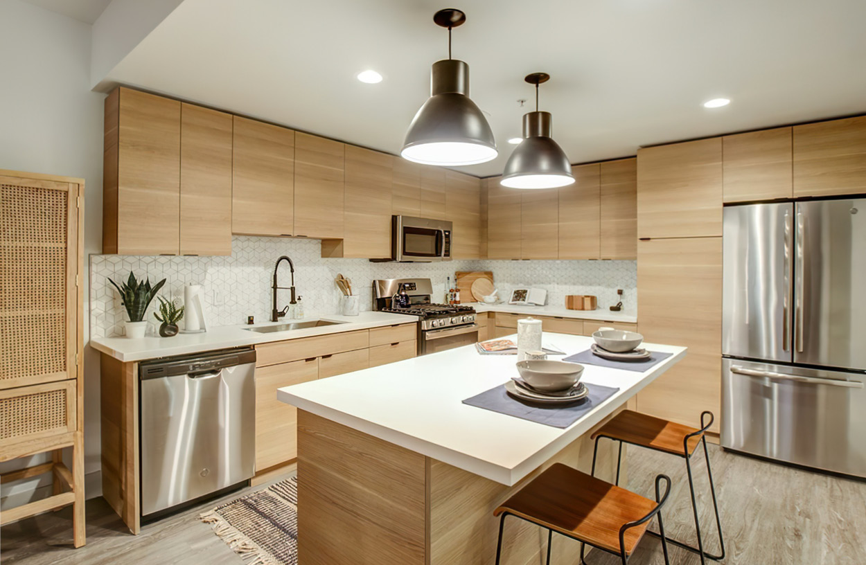 Our unit renovations included the replacement of all cabinets with Italianinspired horizontal custom wood grain, installation of matte black hardware, geometric backsplash, and new Energy Star stainless steel applainces.